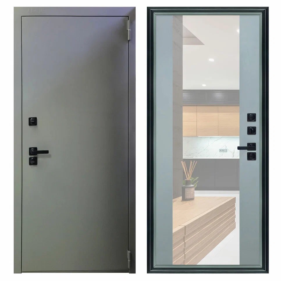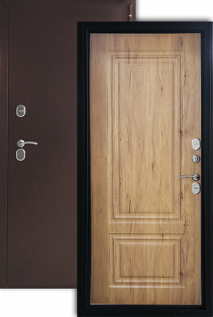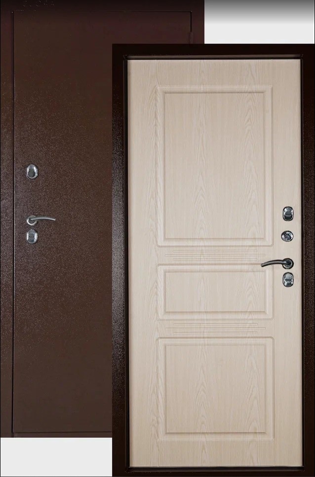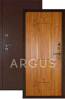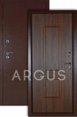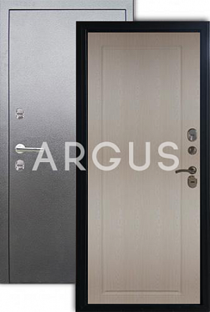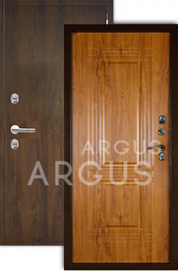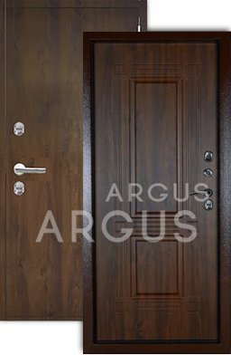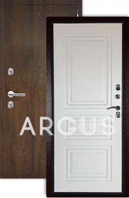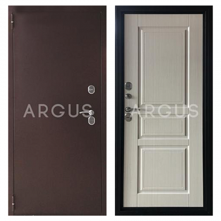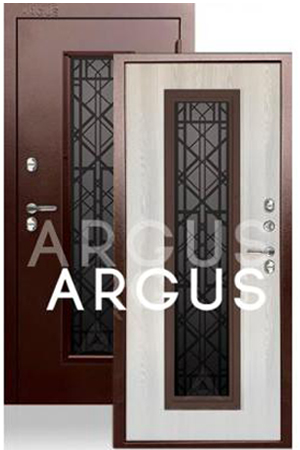 Уличная дверь 'Бриан' с двумя однокамерными стеклопакетами и решеткой 'Бриан' в цвете внутренней отделки 'Ясень ривьера айс', внешней отделки 'Муар Картен'. Двери Аргус-Тепло с системой терморазрыва в полотне и коробке имеют два дополнительных термоизолирующих слоя, многослойное утепление минеральной плитой Knauf и три изоляционных контура.