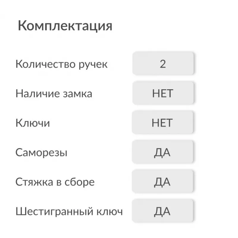 - Комплектация:Комплект ручек на 1 дверь (2 шт.) + крепеж четырехгранный стержень, саморезы, стяжные винты