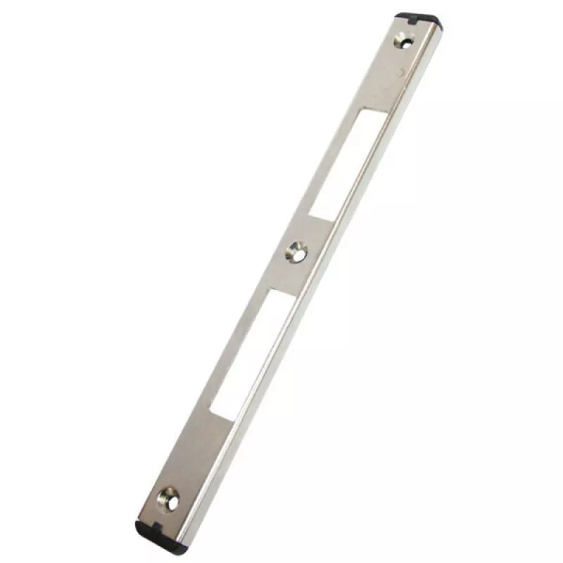 Ответная планка 11.535 правая для замков серии PROFI с ригелем и защелкой. Подходит для установки в пластиковые и алюминиевые двери. Планка нерегулируемая из металлического профиля, с торцов пластиковые заглушки, покрытие никель.