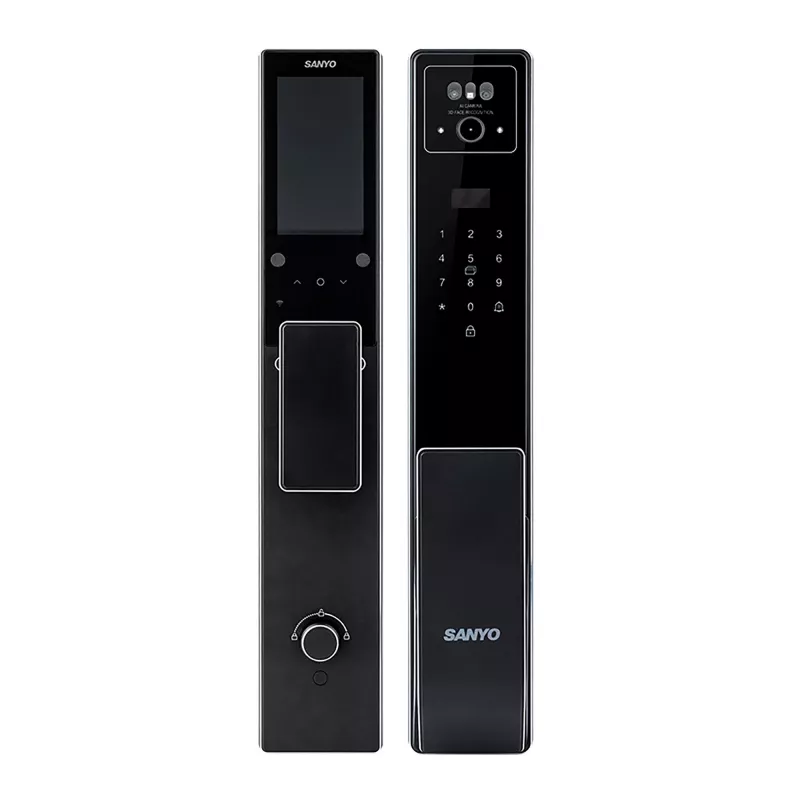 Sanyo D300 Tuya автоматический умный замок с домофоном и камерой высокого разрешения с ночным видением. Для удобства имеет кодовую сенсорную панель с подсветкой. Отпирание и запирание двери происходит нажатием кнопки. Имеет 6 способов разблокировки: отпечаток пальца, сканер лица (Face ID), цифровой пароль, RFID карта, механический ключ, приложение через смартфон. Подходит для входных дверей толщиной 60-120 мм. Обладает современным лаконичным дизайном, четкими линиями и гармонично вписывается в дизайн двери. Прост в установке. Корпус ручки сделан из фрезерованного цельного алюминия. Есть приложение для IOS и Android - Smart Life (Tuya). Взаимодействие с умным домом: Яндекс Алиса, Google Home и Alexa.